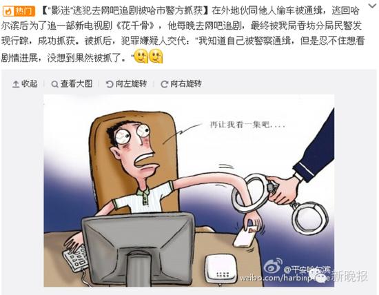 哈尔滨市公安局官方微博截图。另一男子曾经在外地伙同他人偷车被通缉,逃回哈市后,整日提心吊胆过日子,东躲西藏,然而他唯一不能克制的就是追剧。为追新电视剧《花千骨》, 他每晚都去网吧,最终被哈尔滨警方发现行踪成功抓获。被抓后,犯罪嫌疑人交代:“我知道自己被警察通缉,但忍不住想看剧情进展,没想到果然被抓了。”
