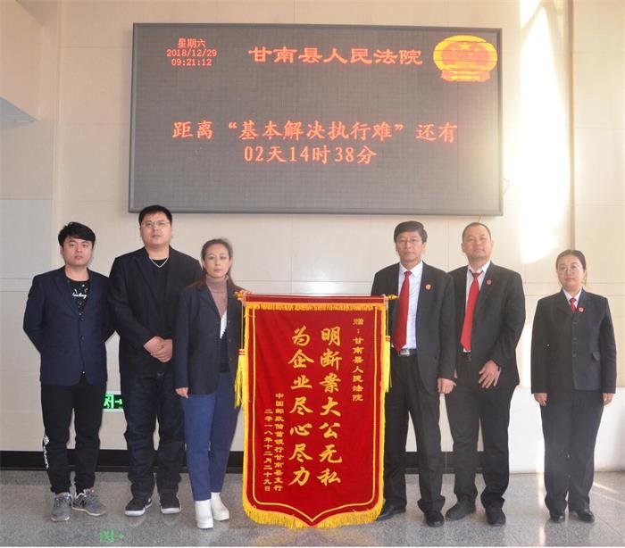 近日,邮储银行甘南支行为甘南法院送来了“明断案大公无私,为企业尽心尽力”的锦旗,对一年来甘南法院依法保护金融债权、稳定金融秩序、防范化解金融风险所做出的快速高效的执行表示感谢。该行金庆丽副行长激动地说:“非常感谢甘南法院,没有你们的辛苦努力,这些钱我们不知道什么时候能收回来啊!”
