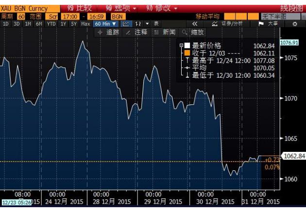 投资者唯恐美国升息将降低非孳息资产黄金的吸引力,因而抛售黄金,导致金价全年下跌约10%。金价曾在12月稍早跌至近六年低位1,045.85美元。