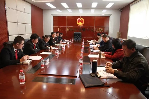1月21日,呼和浩特铁路运输中级法院和内蒙古人社厅领导一行5人,来到哈铁中院考察调研,参加“公众开放日”活动。哈铁中院党组成员、纪检组组长李军和党组成员、政治部主任郭云祥参加座谈会。
