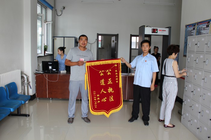 8月5日,申请执行人田某某来到铁力市法院,为执行法官张海龙送上“公正执法 公道人心”的锦旗,赞他公正高效的办案效率,清正廉洁的司法作风。