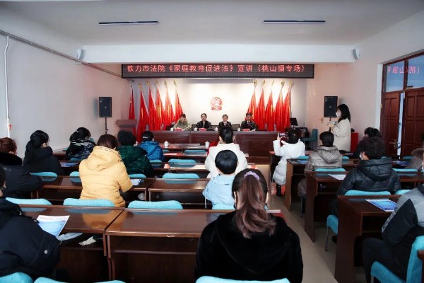 为推进《中华人民共和国家庭教育促进法》(以下简称为《家庭教育促进法》)的宣传普及和贯彻落实,引导群众树立正确的家庭教育观念,切实保障未成年人的健康成长与全面发展,2月16日,铁力市法院联合铁力市妇联、桃山镇政府共同开展《家庭教育促进法》宣讲活动,为辖区内社区委员、学生家长代表、桃山镇机关人员及各村妇女主任等40余人上了一堂别开生面的法治课。