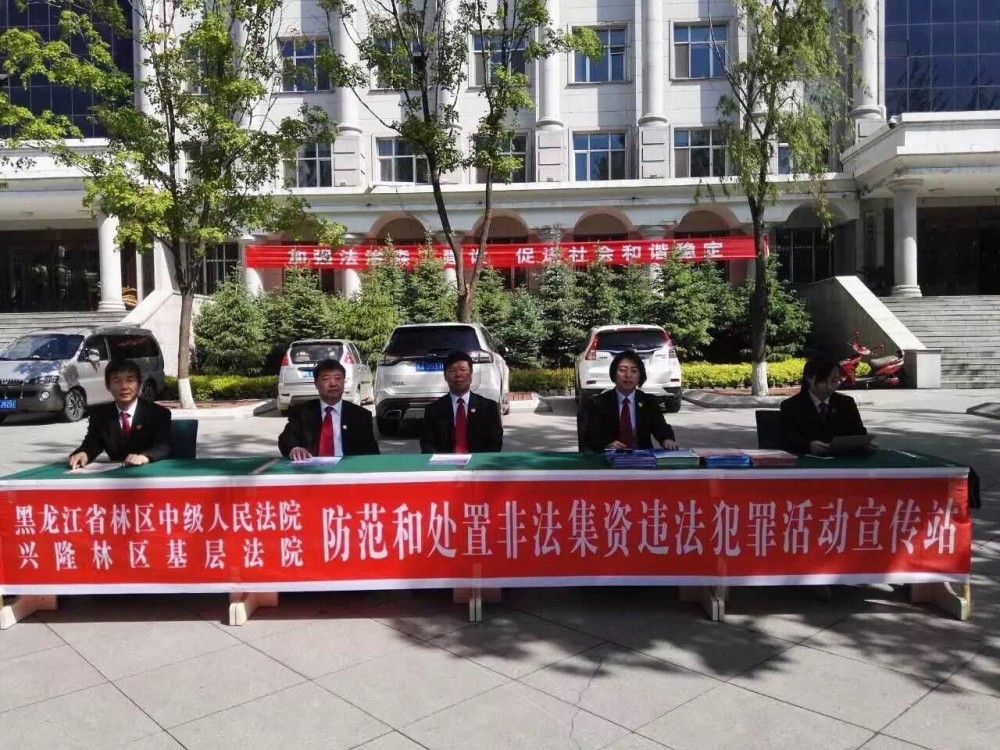 为开展防范和处置非法集资违法犯罪宣传活动,林区中级人民法院成立宣传小组,组长庞志刚一行四人来到兴隆法院,通过在法院门前设置咨询点,悬挂条幅的方式进行宣传,共接待咨询100余人,发放宣传单2000份。