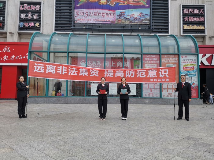为积极引导广大群众对非法集资活动不相信、不参与、能识别、敢揭发,主动远离非法集资,5月29日上午,佳木斯市郊区法院在新大润发超市门前开展“提高风险防范意识 远离非法集资”宣传活动。