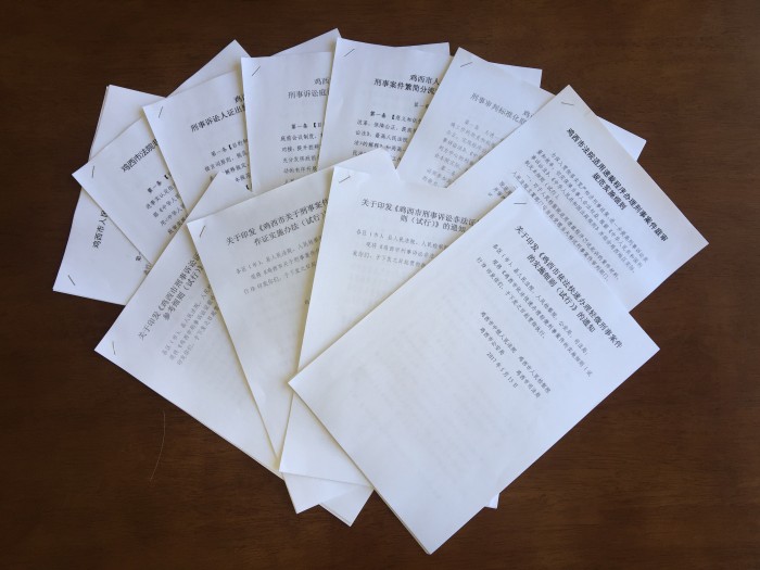 五是注重协调配合。鸡西中院已经将此次改革的背景、目的、政策精神等相关内容向市委政法委进行了汇报,争取获得党委的工作支持,以充分发挥党委统一领导、协调各方的政治优势,统筹协调公安、检察、司法等相关职能部门共同推进各项改革事宜。在与市委政法委的领导和专家进行座谈时,改革意见得到了市委政法委的支持和认可。起草制定的《鸡西市刑事诉讼证据收集与审查参考细则(试行)》、《鸡西市依法快速办理轻微刑事案件的实施细则(试行))》、《鸡西市关于刑事案件侦查人员出庭作证实施办法(试行)》、《鸡西市法律援助值班律师制度暂行办法(试行)》、《鸡西市刑事案件非法证据排除规则(试行)》已经报市委政法委,现市委政法委正组织各政法机关、律师协会及有关人大代表共同研究探讨,待提出修改意见后,公、检、法、司召开联席会议会签下发,全市刑事诉讼活动将遵照执行。