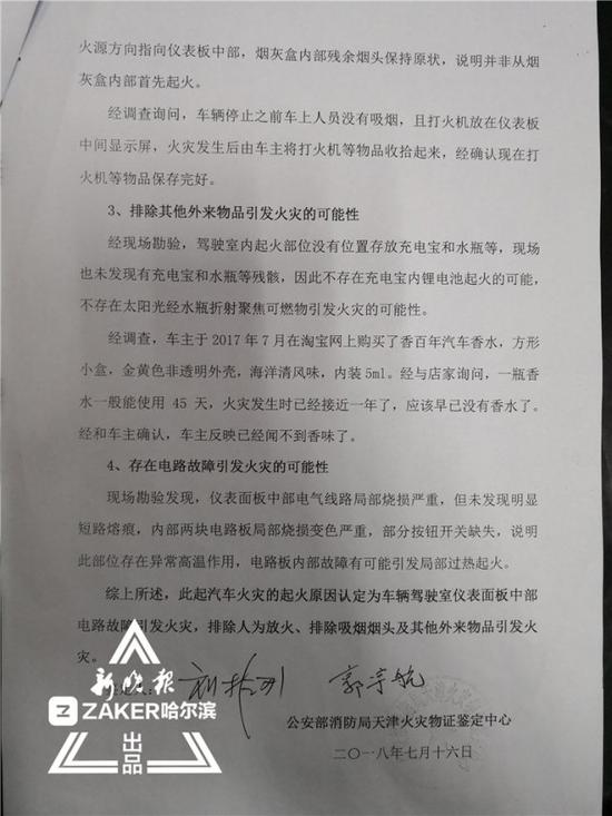 7 月 19 日,鉴定结果出来。由公安部消防局天津火灾物证鉴定中心出具的《关于雷克萨斯汽车(黑 AD63A3)起火原因的鉴定意见》中依据起火部位、现场勘查等展开分析,分别排除了人为放火、吸烟烟头引发火灾、其他外来物品引发火灾的可能性,确定 " 存在电路故障引发火灾的可能性 "。报告中写道:" 现场勘验发现,仪表面板中部电气线路局部烧损严重,但未发现明显短路熔痕,内部两块电路板局部烧损变色严重,部分按钮开关缺失,说明此部位存在异常高温作用,电路板内部故障有可能引发局部过热起火 "。