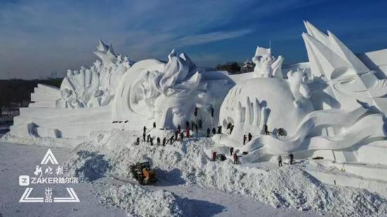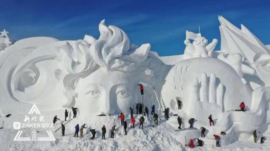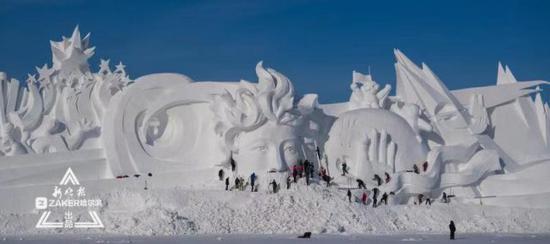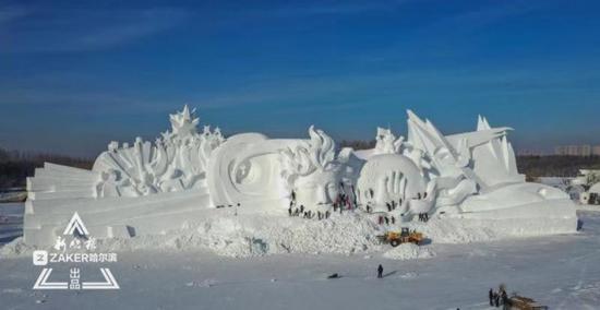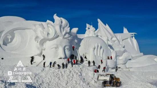雪博会主塑《星河之旅》设计高 32 米、长 106 米、宽 20 米,用雪量达到 4 万立方米。一两天之内,主塑将完整呈现在游客面前。