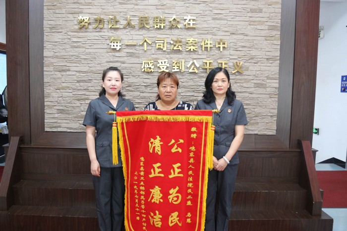 7月31日上午,农民代表郝某将一面写有“清正廉洁、公正为民”的锦旗送到鸡东法院,对法官在审判过程中公正高效、司法为民、切实维护当事人合法权益表示感谢。