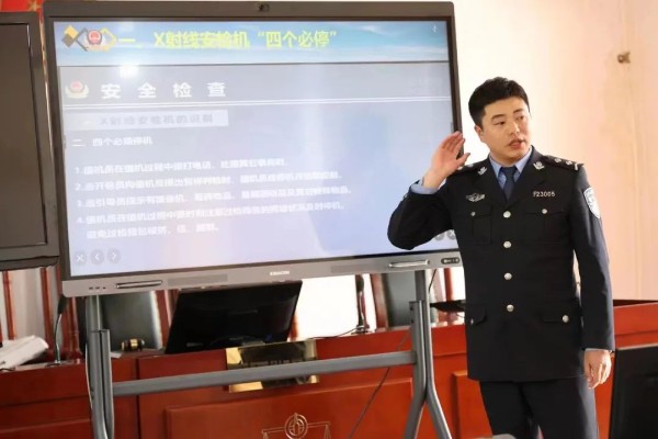 为圆满完成好此次送教活动,法警支队制作了PPT课件和安检视频,内容涵盖了X射线安检机的使用和安检技能实操规范。授课教官现场以理论与实践相结合的教学方式,采取问答、互动示范等形式,就如何规范使用手持安检仪、安检门、X光射线安检机等设备进行了详细的讲解,并对人身安检流程、重点部位检查的动作要领做示范讲解,发现问题,逐个纠正。