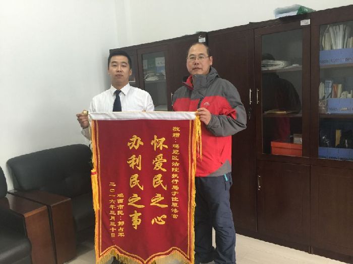 4月5日上午刚上班,被执行人郭腾宇的父亲郭占军就手拿锦旗来到鸡冠区法院执行局,感谢于佳原法官在处理案件过程中的热情耐心。