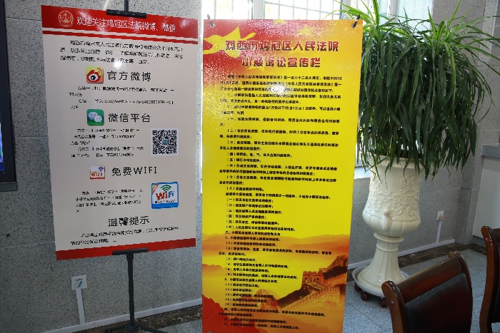 鸡西市鸡冠区法院为诉讼服务中心的来访人员提供免费无线WIFI上网服务,加强诉讼便民服务,增加百姓与当事人对法院的认知度和满意度。