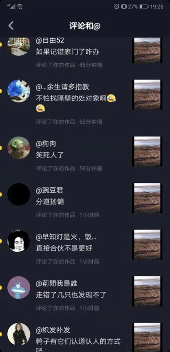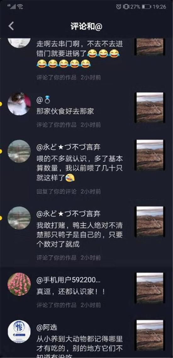 ↑ 肥家,冲鸭!“ 小鸭识途 ” 视频在抖音上播放后,点击量已经逼近 50 万,比视频更吸引人的则是网友评论:“ 比我儿子听话 ”,“ 难道是因为伙食好 ”,“ 谈恋爱了会不会被拐跑 ”,“ 弄只鹅试试,全都带跑偏 ”…… 对此,专家指出,鸭子经过村民圈养训练后,具备识途、认家、认人的能力,这是动物归巢的天性。