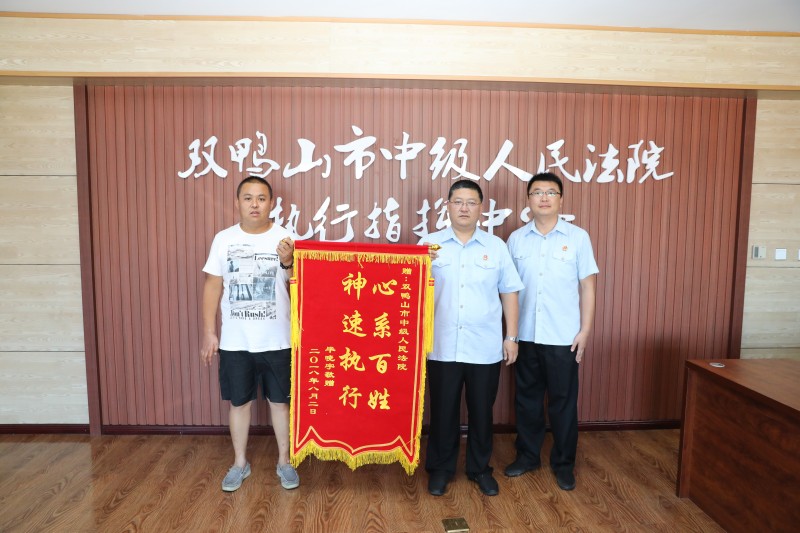 8月2日,申请执行人毕某某专程送锦旗到双鸭山市中级人民法院,感谢院长带头承办执行案件、高效执行案件,维护其合法权益。