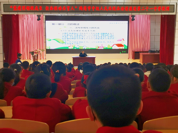 刑二庭副庭长走进鹤岗市第二十一中学,为小学部五、六年级400余名师生讲授了一堂生动的法治教育课。法官以“法的概述”和“网络安全”为主题,运用历史故事和典型案例,生动细致地讲授了“法”的由来、法的产生、现行保护未成年的法律规定、如何远离侵害和违法犯罪,以及法院的职能等方面内容,教育引导学生将法律作为自己行为的准则,运用法律武器维护自身的合法权益,努力成为一个尊法、学法、守法、用法的合格公民。