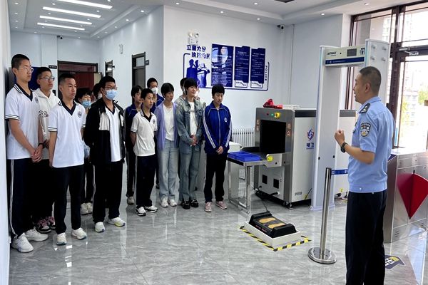 东山区人民法院法警大队副队长史佳麟带领同学们参观了法院安检区及警务指挥中心,介绍了进入法院为什么需要安检、哪些属于不能带入法院的违禁品以及带入违禁物品的危害等,并为同学们现场展示了智慧警务系统。