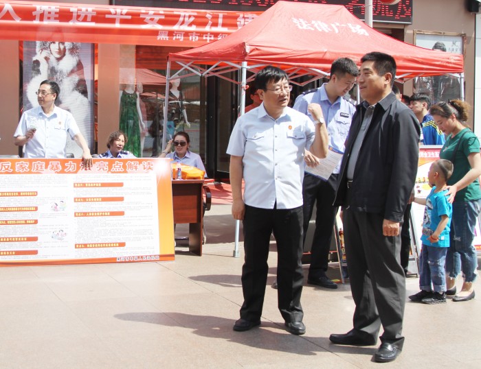 活动当天,黑河中院二十余名干警通过设立义务咨询台、悬挂标语、图板展览、发放宣传材料、提供法律咨询等宣传形式,向群众详细宣传、讲解法律法规常识。此次活动共向市民发放“平安黑河建设”宣传材料800余份,接受群众关于反家庭暴力法等方面的法律咨询50余次。