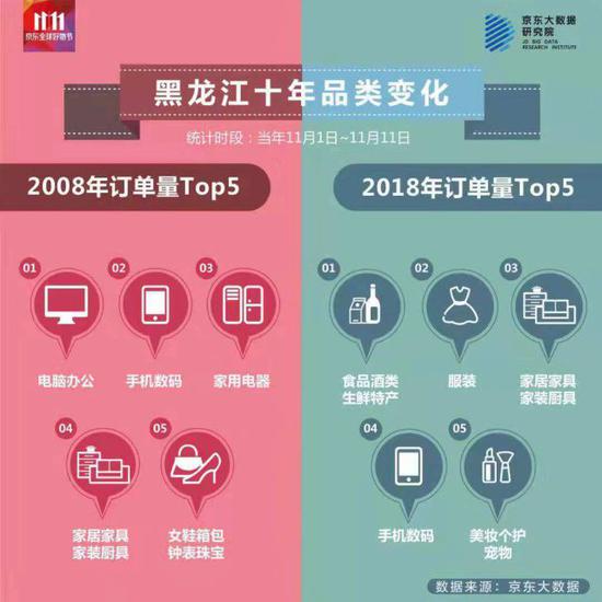 还记得 “ 双 11” 买什么了吗?是不是已经想不起来了,因为买了太多的东西。来看看京东数据回忆一下。记者从京东集团了解到,2018 年 11.11 京东全球好物节,黑龙江省累计消费金额全国排名第 22 位。其中,黑龙江酒类、食品类订单量排名上升幅度全国第一,黑龙江最爱在京东平台购买的商品为哈尔滨红肠、玻尿酸面膜,东北大米、大兴安岭干菌则成为全国用户最爱的龙江特产。