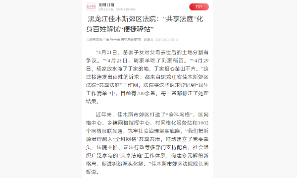 《光明日报》:黑龙江佳木斯郊区法院“共享法庭”化身百姓解忧“便捷驿站”