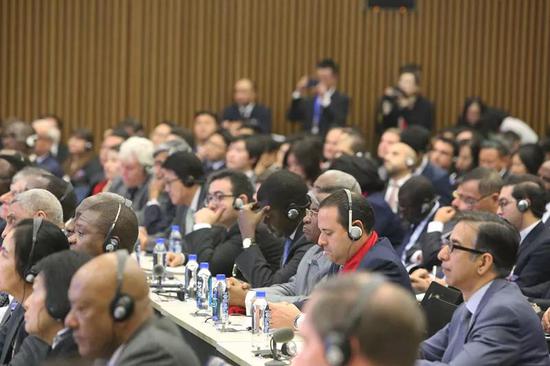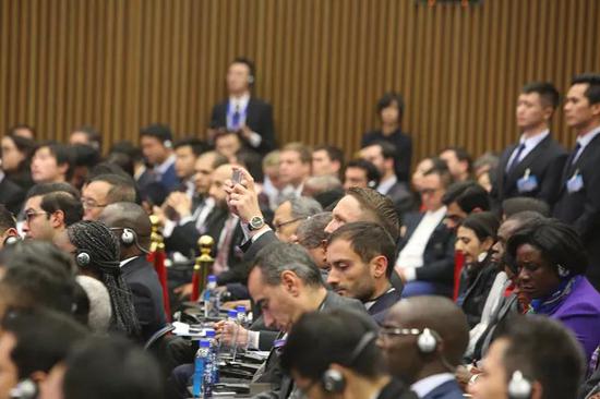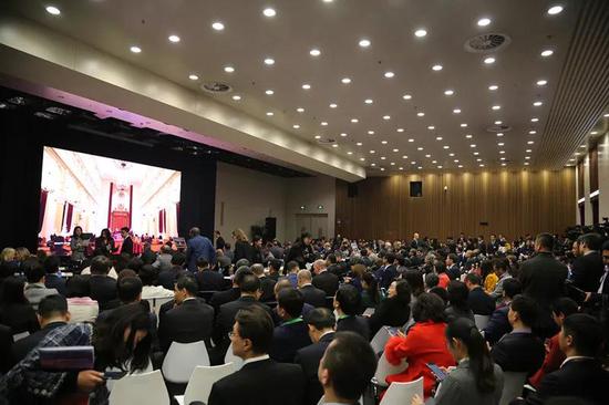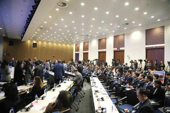 11月12日17点39分,外交部黑龙江全球推介活动准备就绪,会场设置在国家外交部蓝厅,与会领导进入会场。