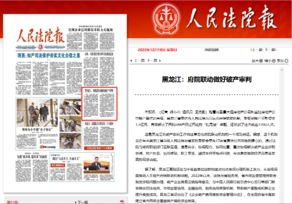 《人民法院报》头版报道:黑龙江法院府院联动做好破产审判