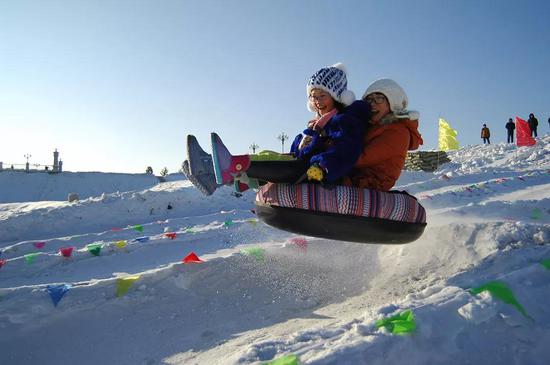“欢乐冰雪”体验区内 ,游客可以佩戴VR眼镜体验“雪域麦加”亚布力高山速降的乐趣;