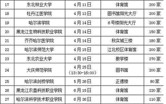 13日,记者从黑龙江省教育厅了解到,为进一步做好我省2018届高校毕业生就业工作,加强供需信息交流与对接,从 14 日开始,我省各高校将陆续举办27场2018届高校毕业生春季校园招聘会。