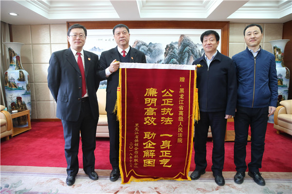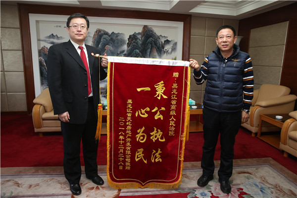 12月29日上午10时30分,黑龙江省庆丰生产资料集团有限责任公司(国有控股)、黑龙江省天屹房地产开发有限公司(以下简称天屹公司)代表一起来到黑龙江高院送上锦旗,对法院执行两公司一起房屋买卖合同纠纷案件表示感谢。