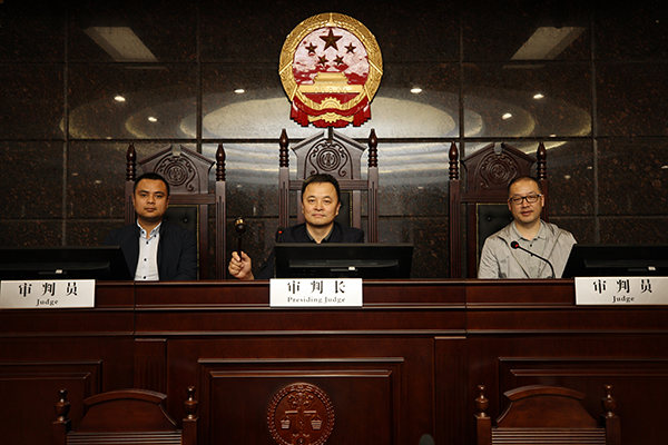 在科技法庭,律师们抛开开庭时的严肃氛围和紧张气息,感受审判席前拍照留念的轻松愉快。