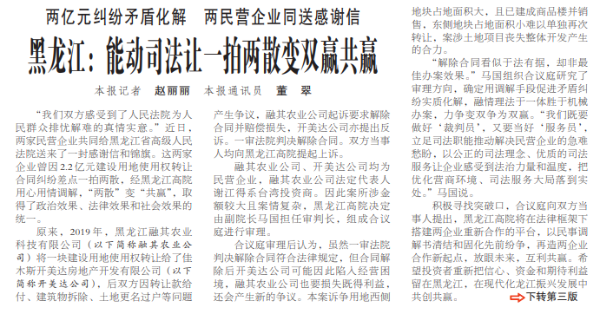 《人民法院报》头版报道黑龙江高院:能动司法让一拍两散变双赢共赢
