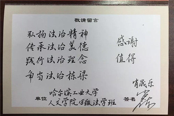 “弘扬法治精神,传承法治美德,践行法治理念,争当法治栋梁。”班长肖晟乐用工整美观的字迹写下了句话。