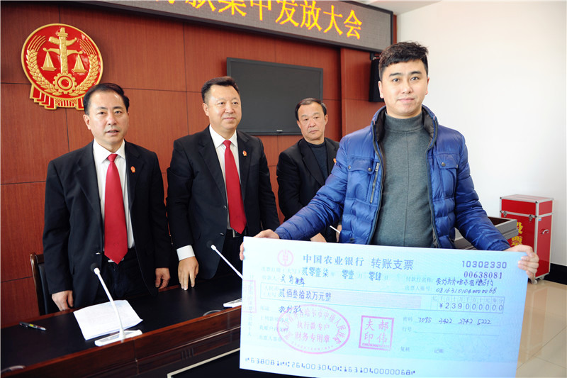 去年12月份,齐齐哈尔市两级法院开展了“涉民生案件集中执行”专项活动。为及时兑现执行成果,依法保障人民群众的合法权益,齐齐哈尔中院执行局于1月5日召开了执行款物集中兑付大会。党组成员、执行局局长杨兴义,执行局副局长黄克、单英伟,执行一庭庭长李云飞向15起案件的申请执行人现场发放了630余万元执行款。