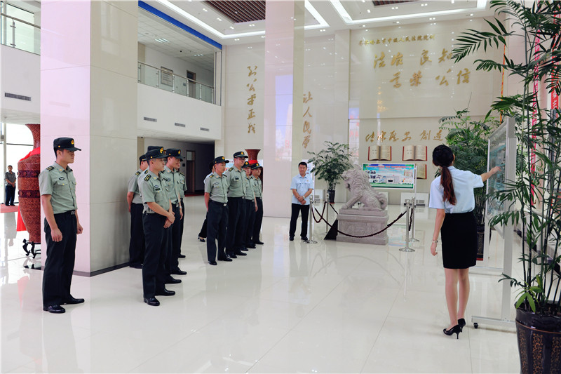 在讲解员的引领下,部队官兵们参观了齐齐哈尔中院阳光大厅、数字化审判法庭等场所,实地了解了齐齐哈尔中院开展作风整顿优化营商环境、攻坚“基本解决执行难”、推进司法体制改革、全面从严治院、党建文化等各方面的工作情况。