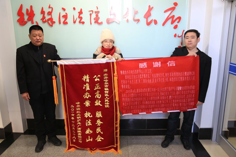 为表达对齐齐哈尔市铁锋法院的赞许和对执行法官公正高效、服务为民执行案件的感谢,哈尔滨红光锅炉总厂有限责任公司专门派人将特别制作的锦旗和感谢信送到铁锋法院。
