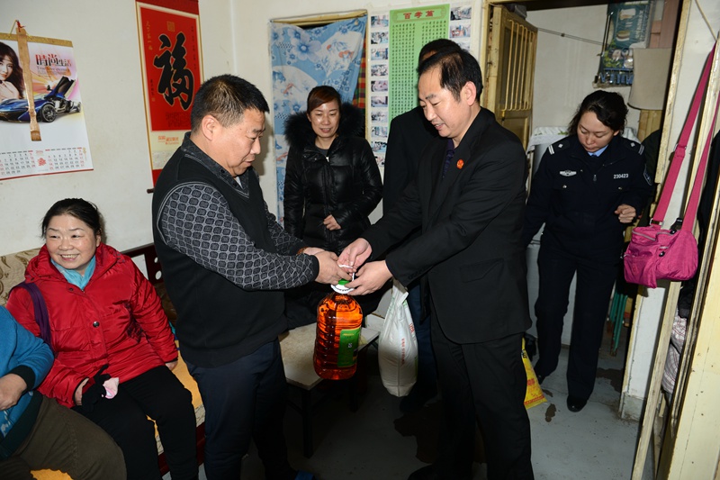 一行人先是来到社区居民葛久发的家中,刚进门他们就把带来的米、面、油等生活必需品交到葛久发的手中,随后详细询问了葛久发妻子的病情和生活状况,葛久发握着法官们的手激动的说:“真的是太感谢你们了,我妻子患病而我又下岗了,铁峰法院不光是为我介绍了新的工作还带了这么多礼物来看望我们,咱法院不光是为老百姓主持公道,更是关心和照顾我们整个家庭的恩人啊。”随后,一行人来到洪健的家中,在送上新年慰问品的同时,不忘鼓励他们要继续保持乐观向上的生活态度,自立自强,勇于战胜困难。