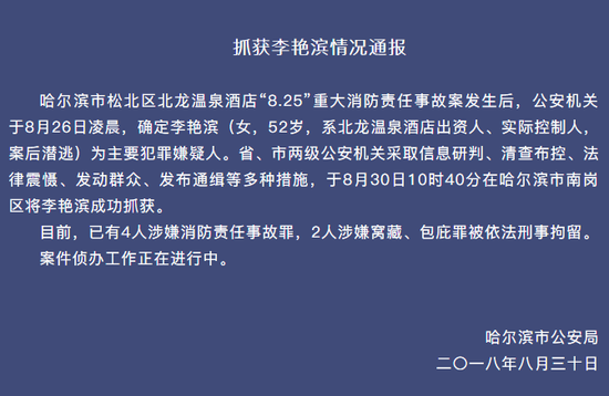 哈尔滨市松北区北龙温泉酒店“8.25”重大消防责任事故案发生后,公安机关于8月26日凌晨,确定李艳滨(女,52岁,系北龙温泉酒店出资人、实际控制人,案后潜逃)为主要犯罪嫌疑人。省、市两级公安机关采取信息研判、清查布控、法律震慑、发动群众、发布通缉等多种措施,于8月30日10时40分在哈尔滨市南岗区将李艳滨成功抓获。